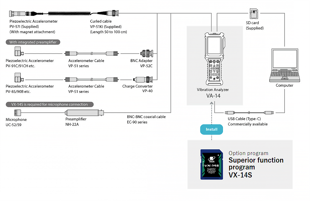 Allows sound measurement by connecting a microphone. Covers both vibration and sound evaluation with just one VA-14 unit. *with optional VX-14S